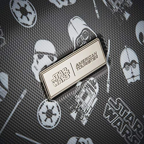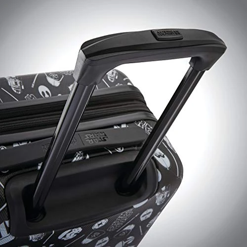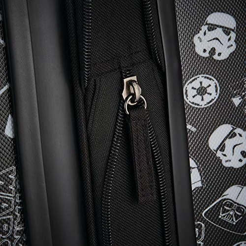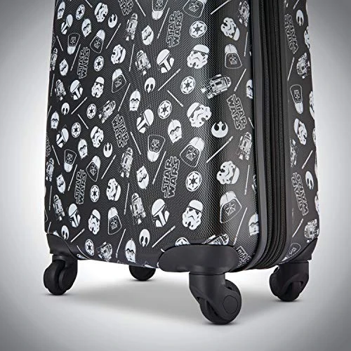 Details: Show your love for your favorite Star Wars character with this hardside upright travel case from AMERICAN TOURISTER. The AMERICAN TOURISTER hardside is made from lightweight and durable ABS material and features a sleek hardside design with side-mounted skate wheels, a mono tube pull handle, and a top grab handle for easy lifting. The interior is fully lined and detailed with crisscross tie-down straps to hold clothing in place and a zip around divider that creates two separate packing compartments. Detailed with colorful graphics of your favorite Star Wars characters, this case is perfect for boys and girls on the go. Pack more fun with this star Wars luggage.