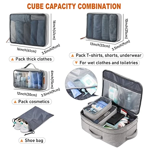 - [EXTRA 4 PACKING CUBES] Travel backpack with four packing cubes. large cube for sweaters, jackets, pants. Medium cube for shirts, shorts. Small cube for toiletries such as makeup, cleanser, etc, there’s also a shoe pocket. Keeping your belongings neater and more organized. without a doubt it’s a large travel backpack. If your clothes get wet, don’t worry, there is a wet pocket at the top of the large compartment, which can hold 2 T-shirts or towels