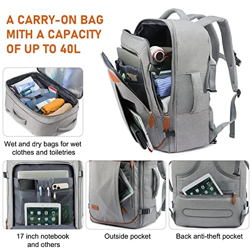 - [LARGECAPACITY EXPANDABLE ]40L travel backpack expandable, can hold the necessary items for 3~7 days of travel, can accommodate three or four sets of clothes, shoes(Comes with a separate shoe bag), and Other daily necessities. The computer compartment can hold a 17-inch laptop. The capacity before expansion is about 32L, and it is 40+L after expansion. It is an ideal travel backpack for men and women.
