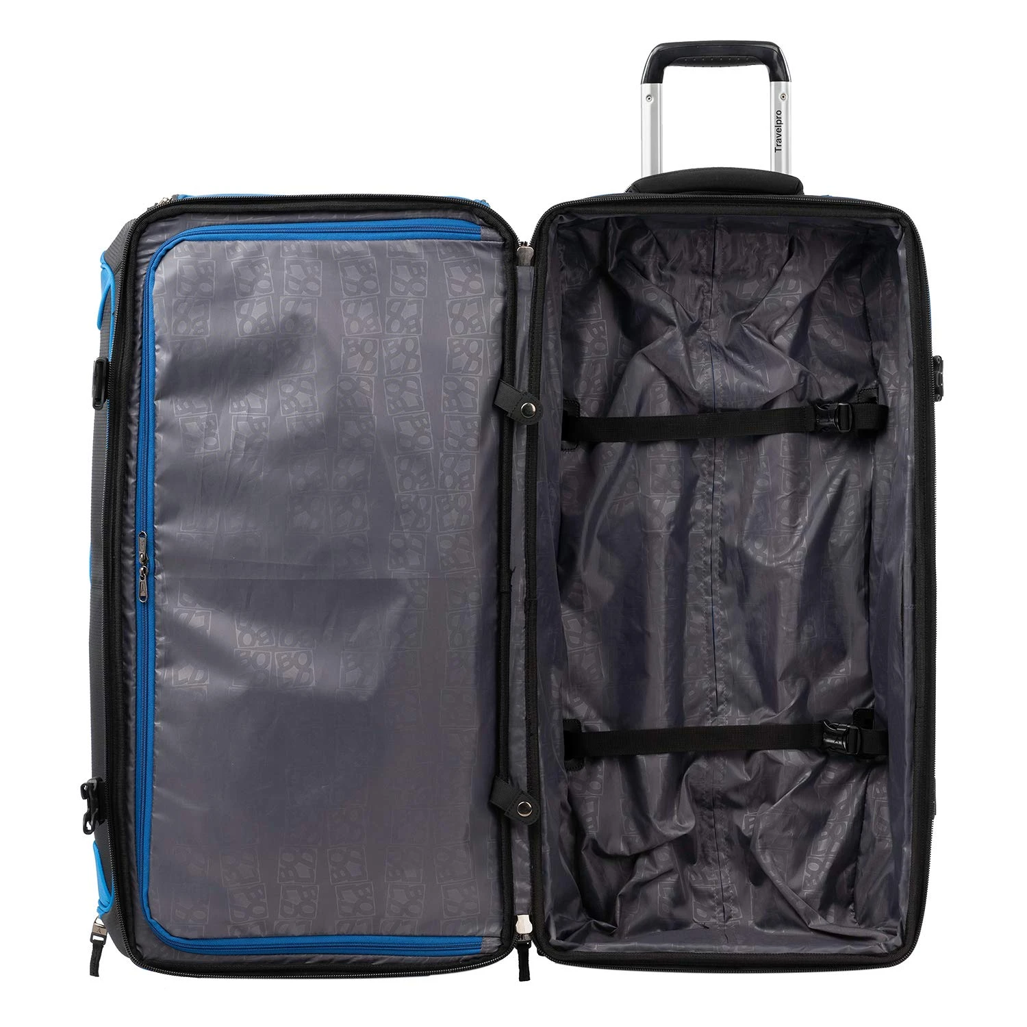 Details: The 30″ Drop Bottom Rolling Duffel is part of the Travelpro BOLD™ Collection. Perfect for the jet-set adventurer, the BOLD by Travelpro 30″ Drop Bottom Rolling Duffel. Made with rugged high-density polyester fabric with water repellent coating. Divider panel with zip closure. Two side pockets to separate clothing, shoes or accessories. Two interior wallet credit card slots. Front zip pocket for quick-access items such as phones, cords, and snacks. Compression straps adjust to the size of your load. Retractable, telescoping handle. Ball-bearing wheels creates a smooth ride on any surface