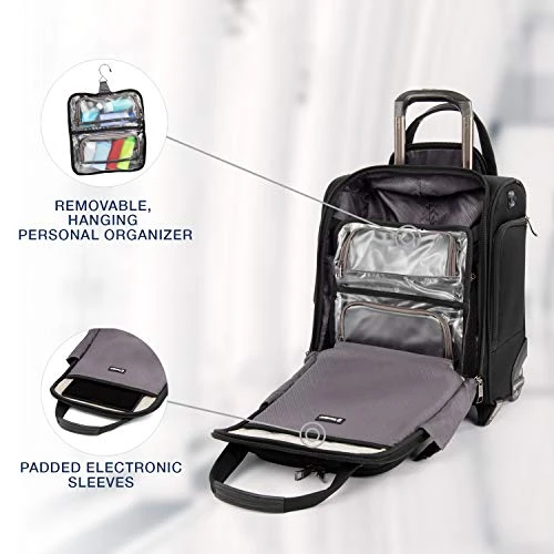 Details: Designed to fit under the seats of most major domestic airlines, The durable crew versapack rolling undersea carry-on keeps you ultra-organized on the fly. Pack it alone for an overnight trip or as a companion to other luggage and enjoy ample interior space, a removable hanging personal organizer with water-resistant compartments and organizational pockets, Padded laptop/tablet sleeves (up to 14″), exterior side pockets fitting for an umbrella or water bottle and a quick-access front pocket with key fob and built-in organizers. Because we’ve thought of everything, a Travelpro quick slip front pocket with magnetic closure is perfect for storing a cell phone or other essentials when going through airport security, while an external USB port with faa-compliant dedicated power bank pocket lets you power up electronics on the move. Hit the road, sidewalk or terminal on two ultra-strong, high-performance ball bearing wheels that provide a smooth roll over any terrain, led by a height-adjustable PowerScope handle. Carrying options also include dual handles and a rear stacking strap to secure the tote to another rolling bag for hands-free mobility. Built for professional-grade dependability With robust corner armor, skid guards and heavy-duty wheel housings, crew versapack is the civilian version of the luggage flight crews use, tested to meet the same superior quality and durability standards.